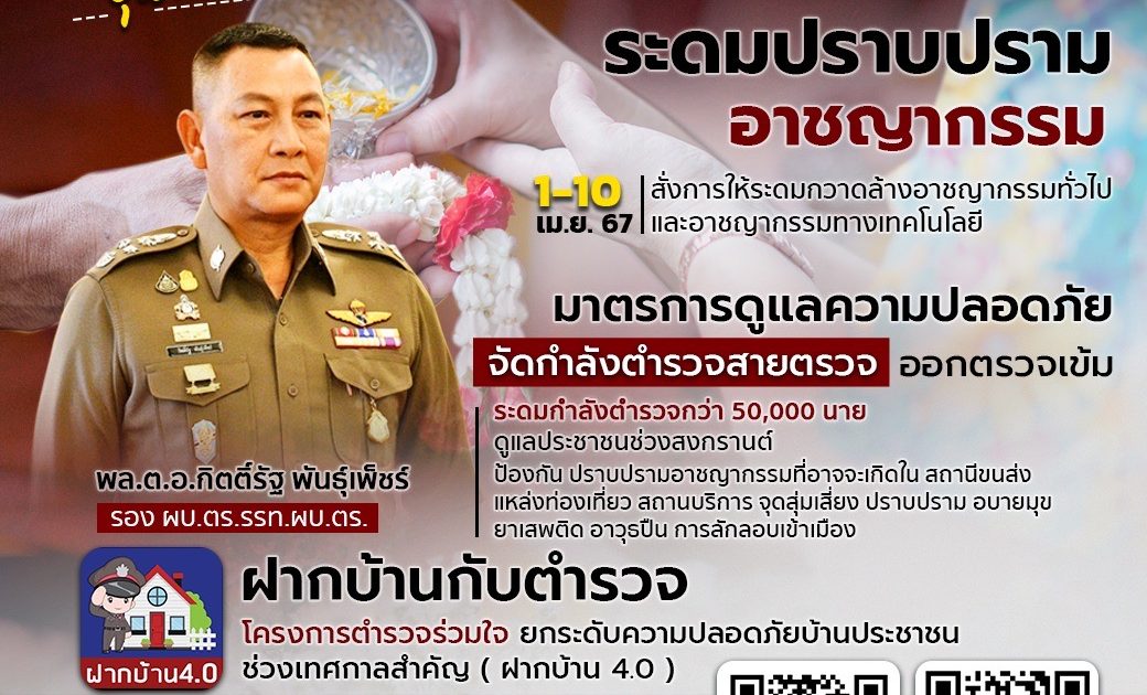 สำนักงานตำรวจแห่งชาติ ออกมาตรการป้องกันและปราบปรามอาชญากรรม ให้กองบัญชาการตำรวจนครบาล , ตำรวจภูธรภาค 1-9 , กองบัญชาการตำรวจสอบสวนกลาง , กองบัญชาการตำรวจปราบปรามยาเสพติด , กองบัญชาการตำรวจท่องเที่ยว , สำนักงานตรวจคนเข้าเมือง , กองบัญชาการตำรวจสืบสวนสอบสวนอาชญากรรมทางเทคโนโลยี และกองบัญชาการตำรวจตระเวนชายแดน จัดทำแผนปฏิบัติการป้องกันปราบปรามอาชญากรรมพื้นที่จัดกิจกรรมสงกรานต์ และระดมกวาดล้างอาชญากรรมทุกประเภท ทั้งอาชญากรรมทั่วไป และอาชญากรรมทางเทคโนโลยี ช่วงก่อนวันหยุดเทศกาลสงกรานต์ วันที่ 1-10 เมษายน 2567
