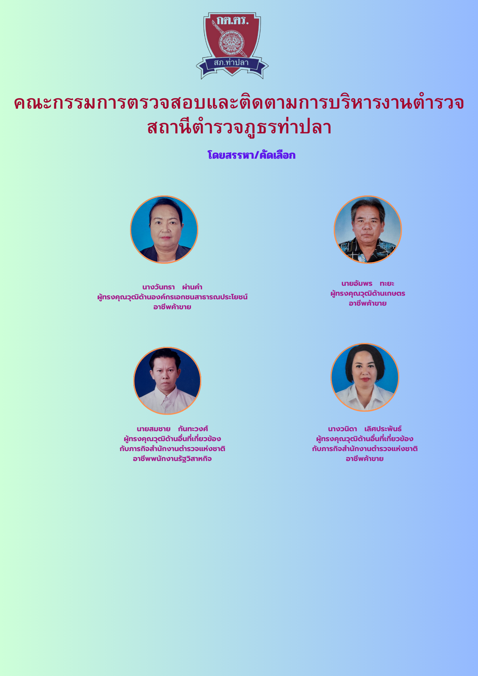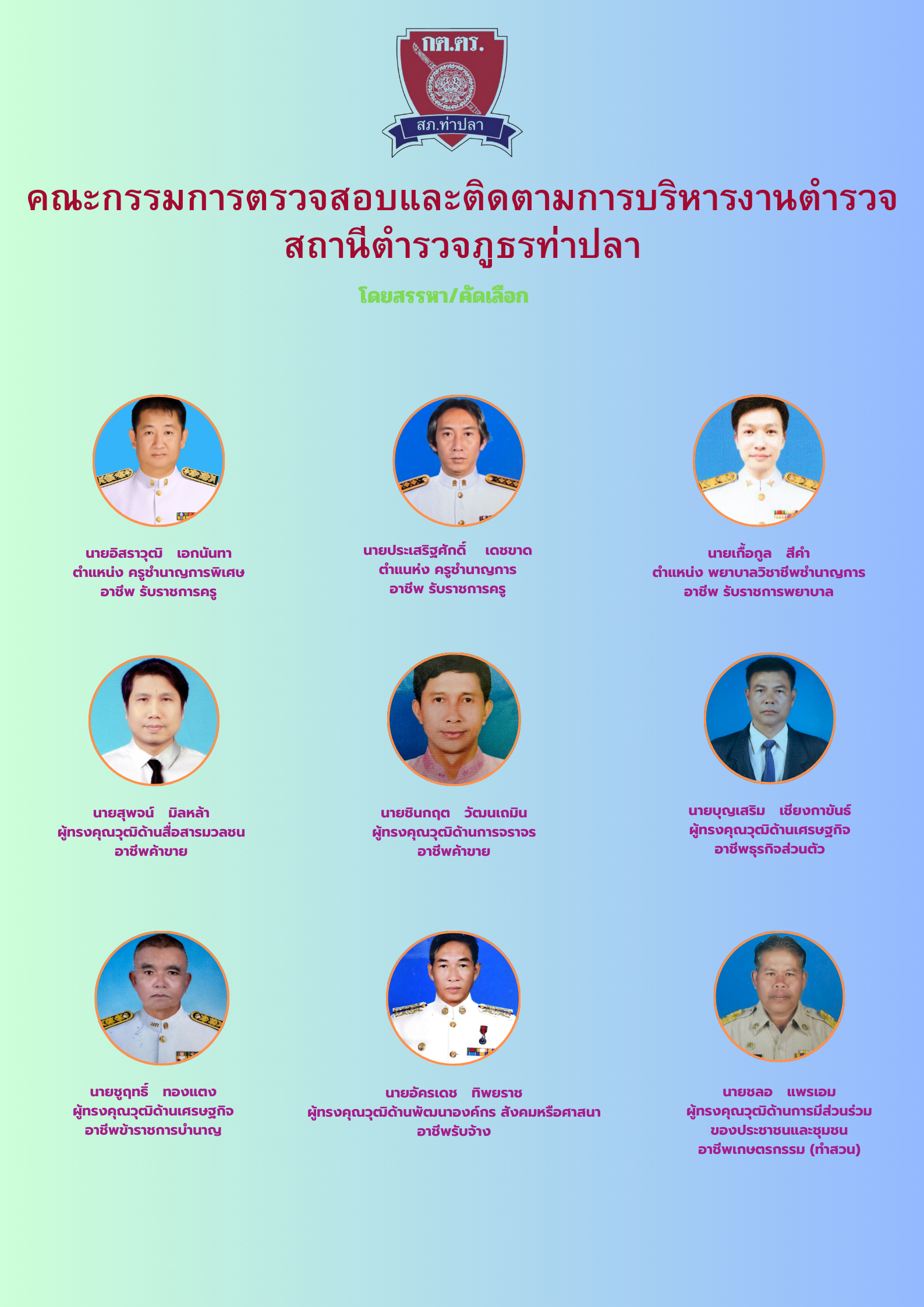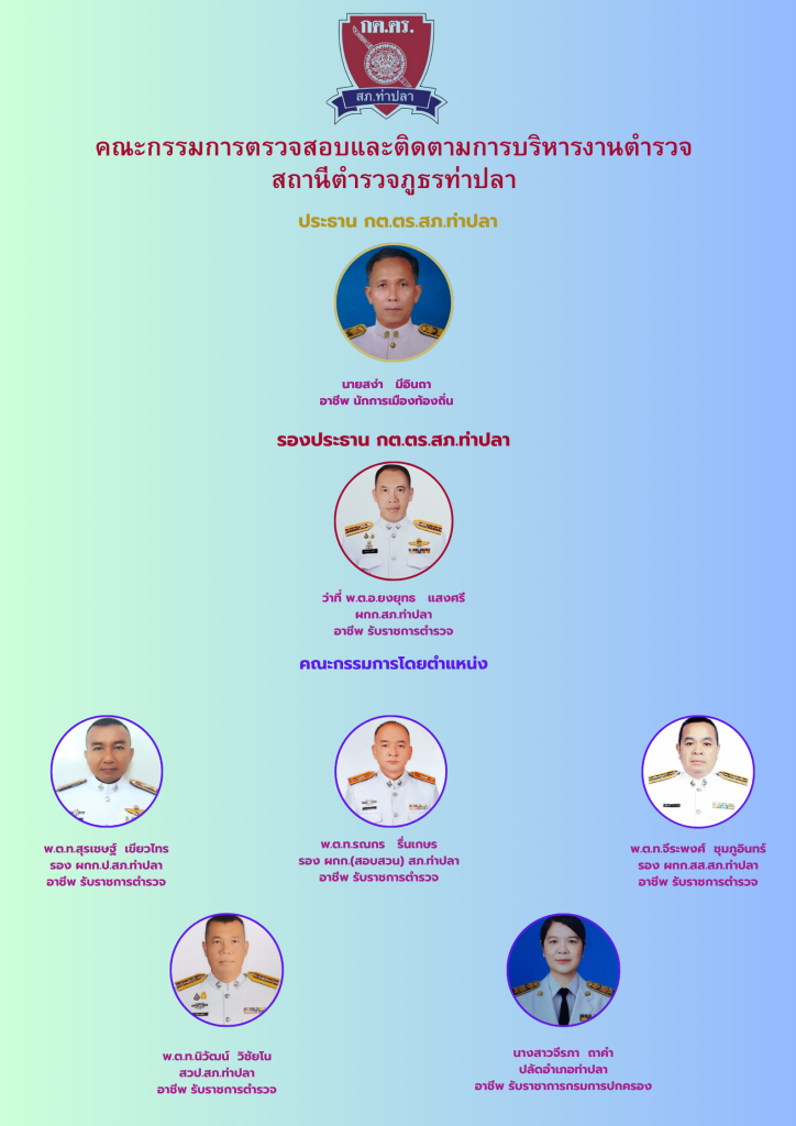 - รายชื่อคณะกรรมการตรวจสอบและติดตามการบริหารงานตำรวจ (กต.ตร.) สถานีตำรวจภูธรท่าปลา